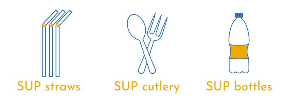 Single-use plastic (SUP) disposable: a plastic product with an intended lifespan of one use, i.e. one meal, one drink, or disposed of within 24 hours. Ex: